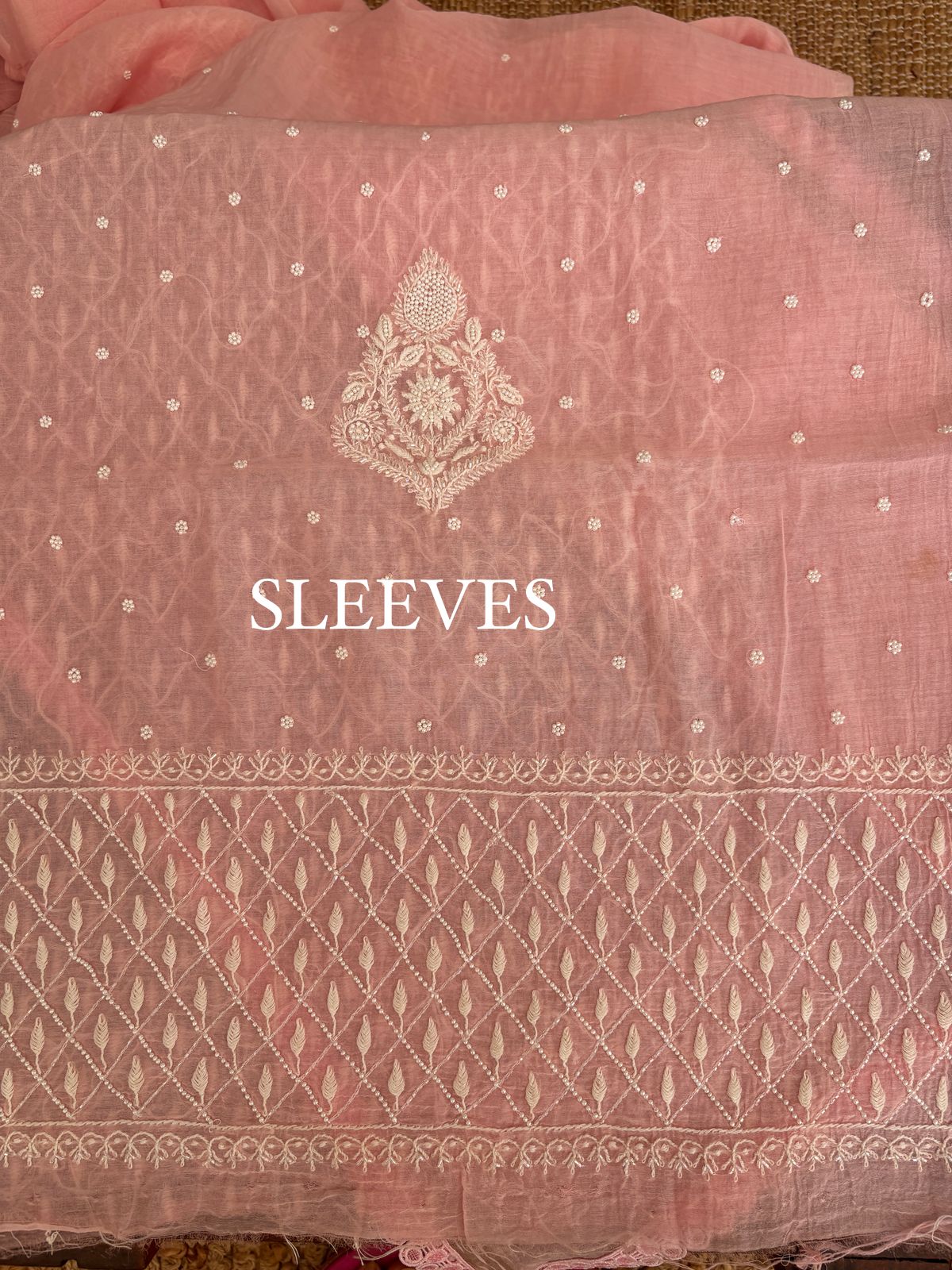 Description : Exclusive pure Mul Chanderi two-piece suit with fine intricate Chikankari and Daraz work, embellished with pearl and golden aari work, paired with a stunning lace on dupatta.